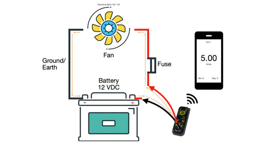 Let's take an example, the ampere is the workforce of the battery flowing through the vehicle's circuits and thusly activating what needs to be working, (electrically) The most significant thing is always having the correct electron flow to components. Whether starting a motor, fan, relay, or light-bulb, everything on a vehicle has a specific amperage draw. For example, let's supposed that a fan is designed to operating at 12 volts, 5A, which means the fan is designed to run on a 12-volt circuit with 5 amps.