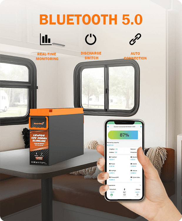 Hit the road without limits. The Enjoybot 12V 200Ah LiFePO₄ Battery is the ultimate power upgrade for RVs, campers, and travel trailers. Its ultra-slim design saves precious storage space, while the 200A BMS and Grade-A cells deliver reliable power for air conditioners, refrigerators, and other energy-hungry appliances. With Bluetooth monitoring and low-temperature protection, this lithium RV battery keeps your adventures running smoothly—whether you’re camping off-grid or touring the country.
