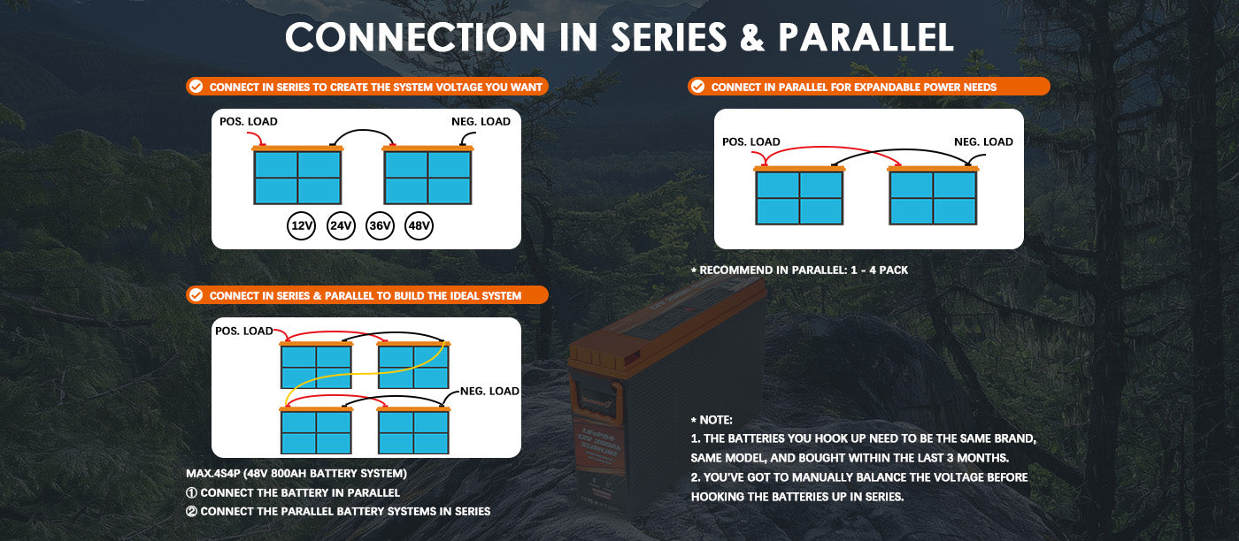 Yes. You can connect up to 4 batteries in series and 4 in parallel (4S4P) to build a massive 48V 800Ah lithium battery bank for solar storage, off-grid living, or whole-home backup.