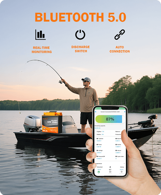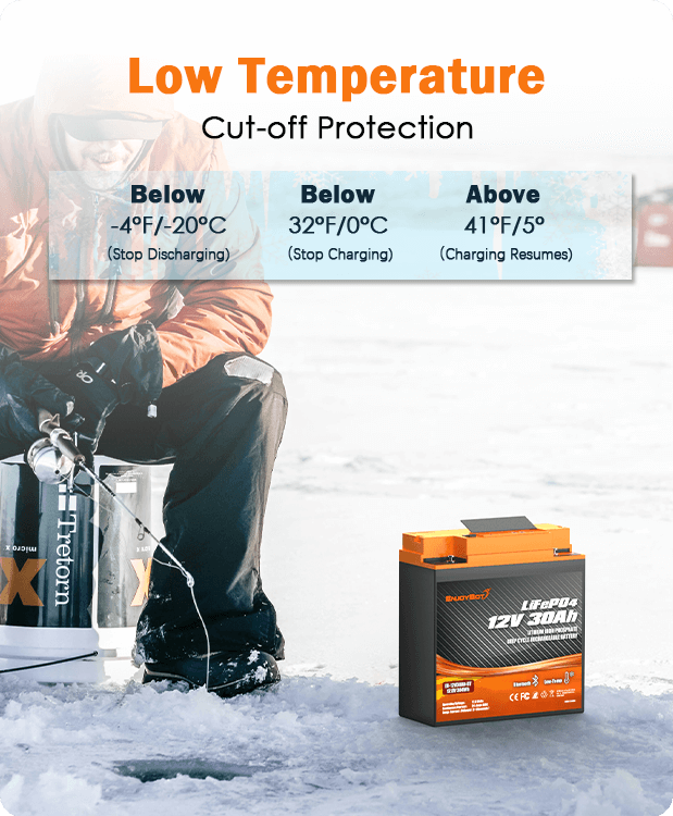 Cold weather is no problem. The smart BMS automatically stops charging at 32°F, prevents discharging below -4°F, and safely resumes charging once temps rise to 41°F. That means your battery stays protected, and you stay powered up — even during long winter ice fishing trips or chilly overnight adventures.