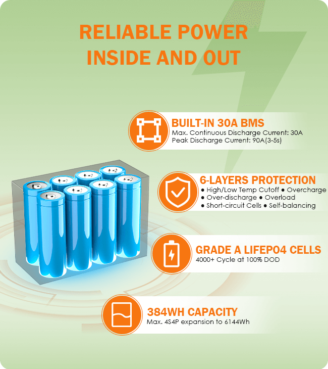 Inside, 8 Grade-A cylindrical LiFePO₄ cells work together to deliver 384Wh of dependable power. The advanced 30A BMS ensures safety with overcharge, over-discharge, short-circuit, and temperature protections. With continuous 30A output, 90A peak bursts, and expansion up to 48V 120Ah, this battery is as tough as it is versatile.