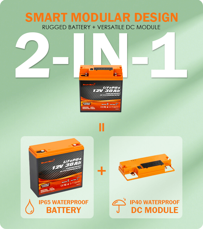 This 12V 30Ah lifepo4 battery features a modular setup — run it as a standalone waterproof battery (IP65) for outdoor use, or attach the direct-charge module (IP40) for multi-device charging. This flexible design adapts to your needs, giving you durability when you’re in rough conditions and convenience when you need extra outputs.