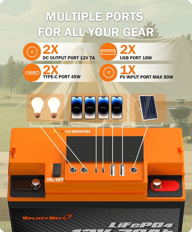 A: Yes! The Enjoybot 12V 30Ah battery with direct-charge module can power multiple devices simultaneously, including phones, tablets, fish finders, cameras, and lights. It’s designed for outdoor users who need multi-port portable power on the go.