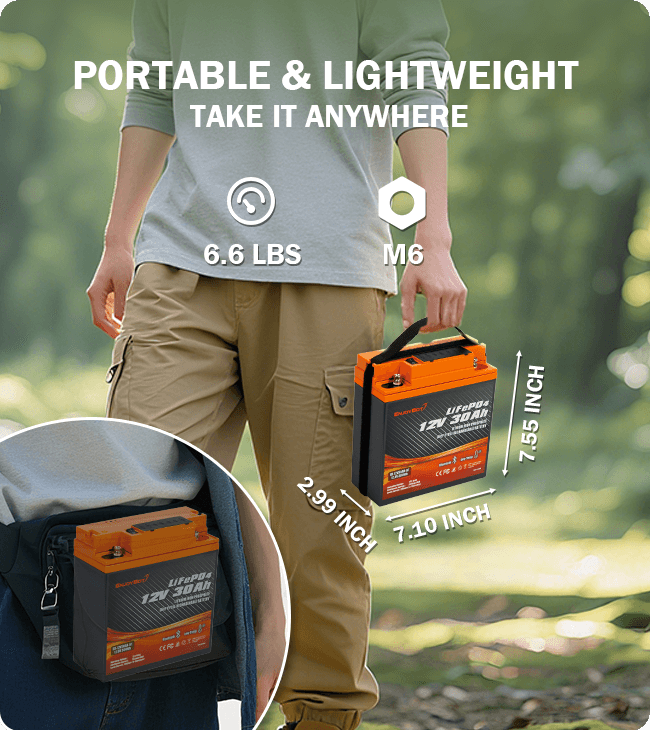 Weighing in at just 6.6 lbs, our 12V 30Ah Lithium battery is designed to move with you. Use the included strap to carry it by hand or slide it into your backpack for ultimate portability. Whether you’re hiking to a remote campsite, setting up for a day of ice fishing, or powering gear on the go, it won’t slow you down.