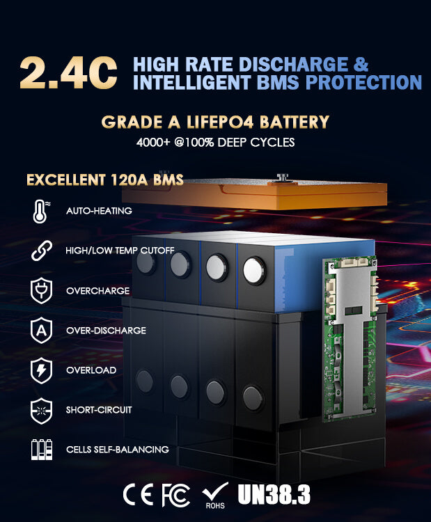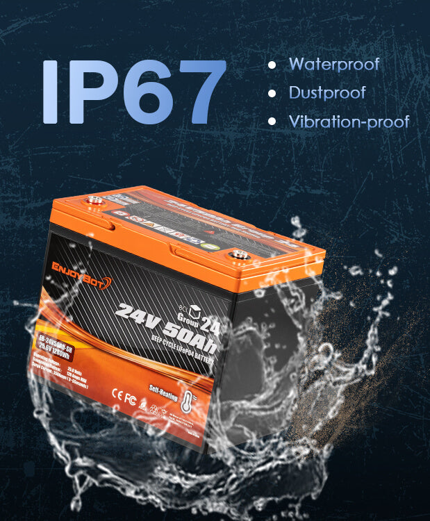 Enjoybot 24V 50Ah lithium battery is equipped with an advanced 120A intelligent BMS, providing exceptional safety and performance. With a continuous discharge capacity of 120A and a peak current of 350A (for 3-5 seconds), this battery can deliver a high discharge rate of up to 2.4C, making it suitable for demanding applications. The intelligent BMS includes six comprehensive protection features. These safety mechanisms ensure long-term reliability, preventing damage and maximizing the lifespan of your battery.