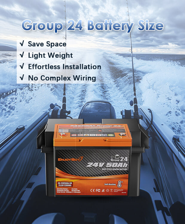 A: Group 24 batteries are smaller, typically measuring 10.5" L x 6.19" W x 8.88" H. They are ideal for lighter-duty applications like small boats, RVs, and backup power systems. Enjoybot 24V 50Ah LiFePO4 lithium battery, measuring 10.23 x 6.61 x 8.22 inches, is an ideal replacement for Group 24 batteries.