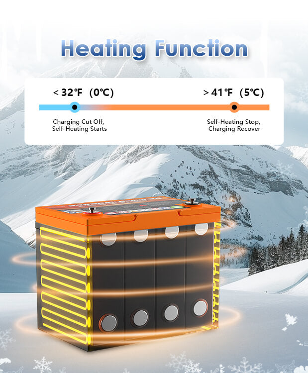 This 24V lithium battery features an automatic self-heating function. When the temperature drops below 32°F (0°C), charging is automatically suspended, and the built-in heating pad activates to warm the battery. At this time, the charger powers only the heating pad, ensuring safe operation. Once the temperature reaches 41°F (5°C), heating stops, and charging resumes, ensuring optimal battery performance in cold conditions.