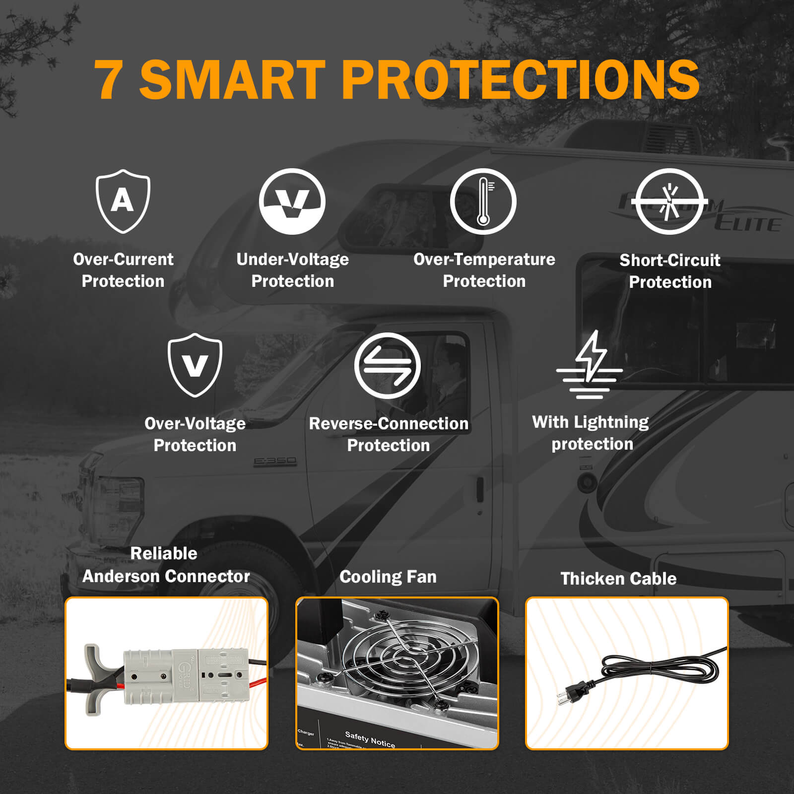 [Multiple Protections] The charger is reliable with multiple protections, such as over voltage protection, over current protection, short-circuit protection, reverse protection, under-voltage protection, and lightning protection prevent damage by faulty operations.