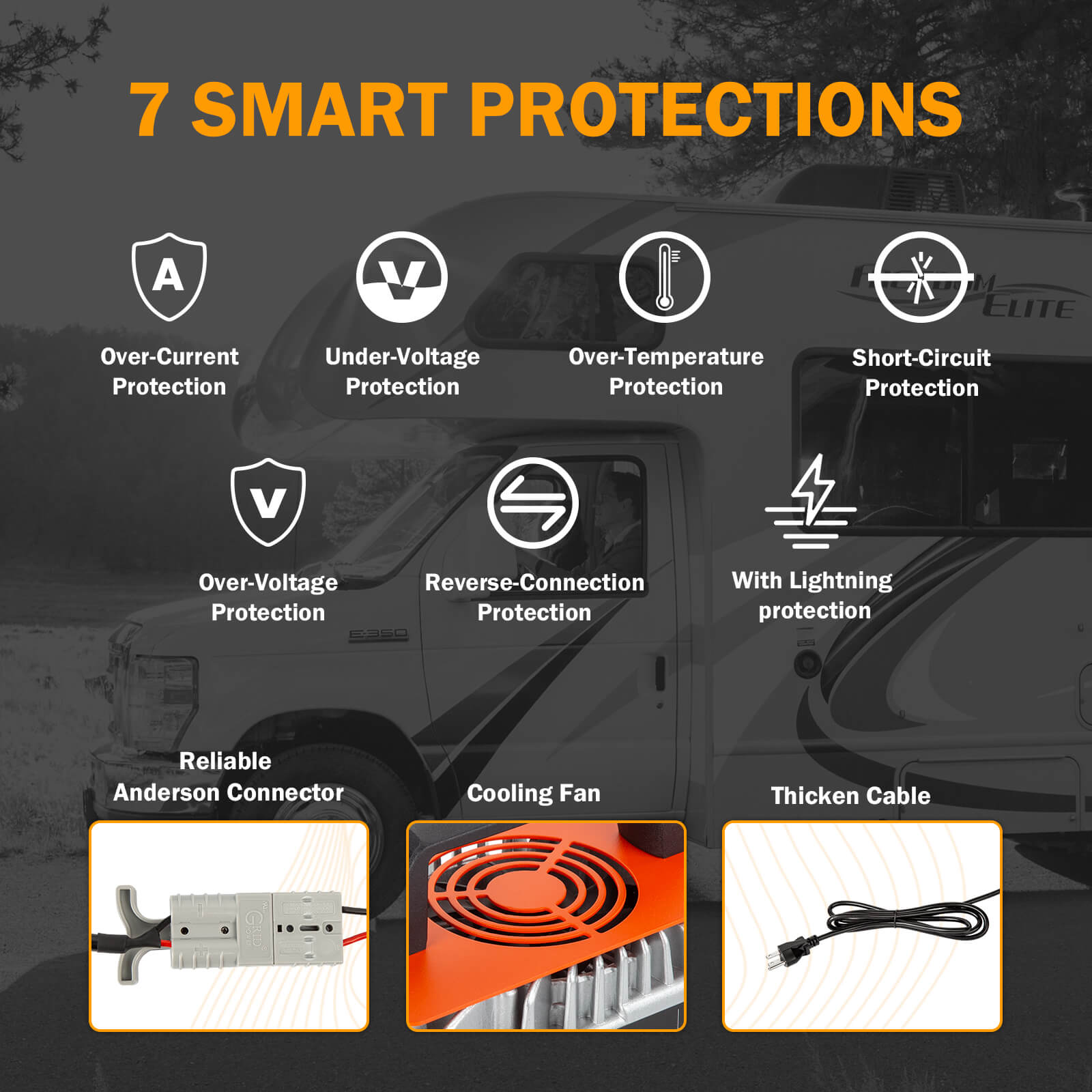 [Multiple Protections] The charger is reliable with multiple protections, such as over voltage protection, over current protection, short-circuit protection, output reverse protection, charger over temperature protectionthat prevent damage by faulty operations.