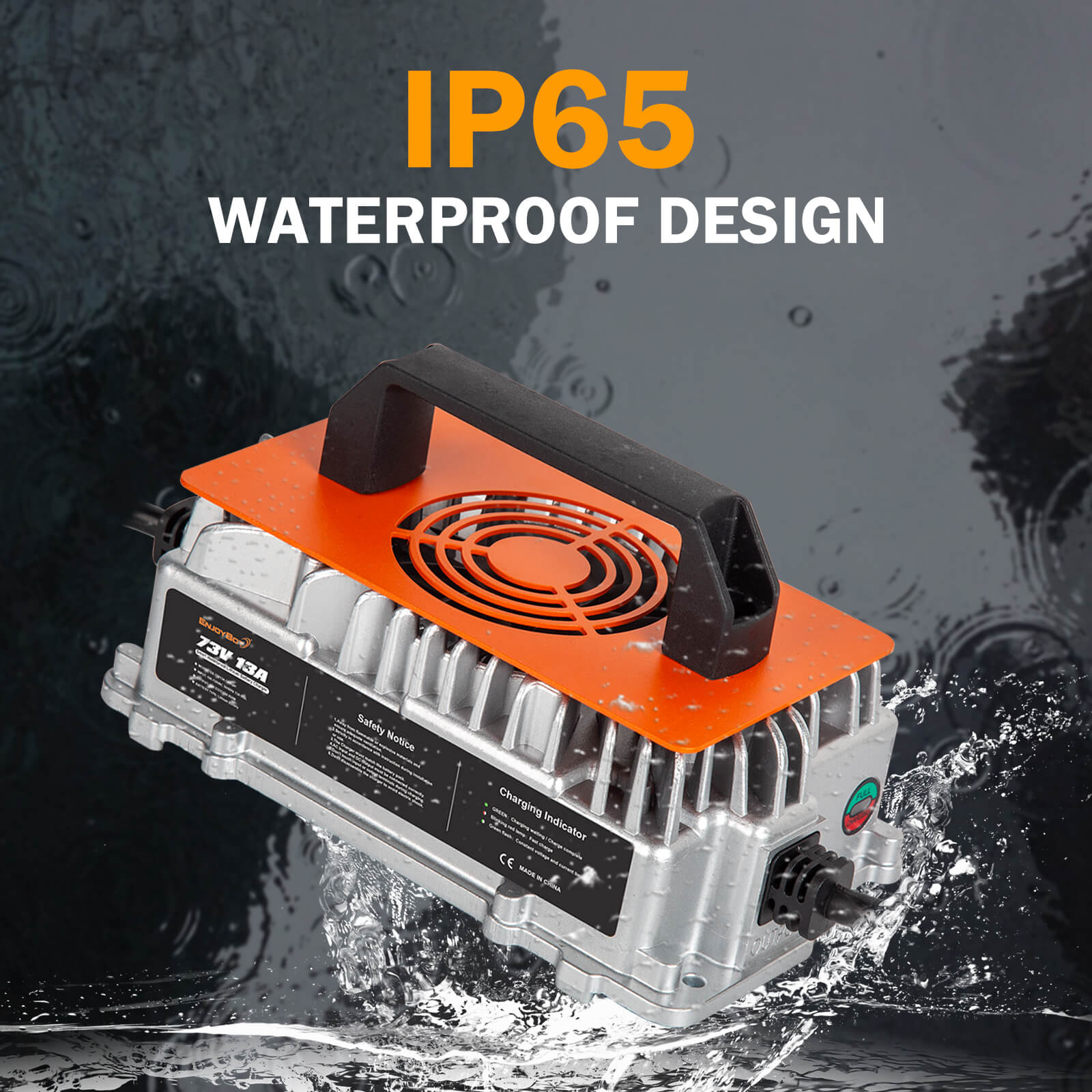 [IP65 Waterproof] 60V lithium golf cart battery charger constructed with a durable die-cast aluminum alloy casing providing exceptional durability. One-piece molding process, you don’t worry about your charger being damage by water, dust or vibration.