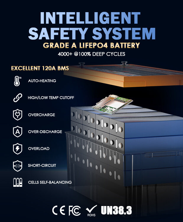 This 48V lithium battery features a built-in 120A BMS with 7 advanced protection functions, ensuring optimal safety and performance. It delivers up to 120A continuous current and a peak current of 500A (for 3-5 seconds), making it a dependable power solution for various applications, including golf carts, RVs, home emergency backups, and solar systems.